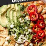 - Season and Serve: Taste and adjust seasoning with additional salt, pepper, or buffalo wings sauce. Thin the chili with extra chicken broth if desired. Serve hot topped with blue cheese, crushed tortilla chips, chopped avocados, sour cream, and/or fresh cilantro.