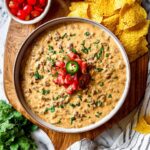 Rotel Cheese Dip is a creamy, cheesy, and zesty dip bursting with bold flavors from a perfect blend of spices, salsa verde, and Rotel tomatoes and chilies. Made with lean ground beef, full fat cream cheese, and mild cheddar, this dip is luxuriously creamy without any processed cheese. Perfect for serving warm with tortilla chips and garnished with fresh diced tomatoes, cilantro, and hot sauce.