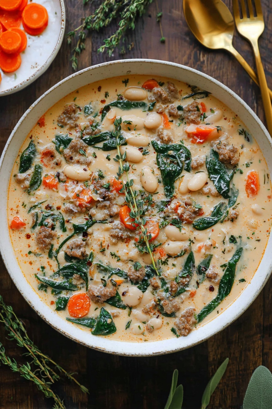Sausage White Bean Soup is a hearty and comforting dish featuring spicy Italian sausage, creamy white beans, fresh vegetables, and a touch of cream. Perfect for chilly nights, this one-pot soup offers a balanced blend of flavors with tender carrots, spinach, and herbs simmered in a rich broth.