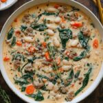 Sausage White Bean Soup is a hearty and comforting dish featuring spicy Italian sausage, creamy white beans, fresh vegetables, and a touch of cream. Perfect for chilly nights, this one-pot soup offers a balanced blend of flavors with tender carrots, spinach, and herbs simmered in a rich broth.
