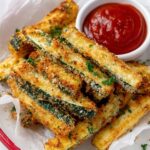 Crispy and flavorful baked zucchini fries coated with Parmesan cheese and panko breadcrumbs, perfect as a healthy snack or side dish.