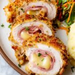 This classic Cordon Bleu Chicken recipe features tender chicken breasts stuffed with Black Forest ham and Swiss Gruyere cheese, breaded with a crispy seasoned panko crust, and baked to perfection. Served with a creamy Dijon sauce, it's a comforting and elegant main dish perfect for dinner.