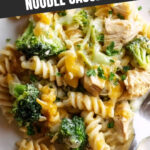 A comforting Chicken Noodle Casserole made with rotini pasta, broccoli, tender cooked chicken, and a creamy homemade cheese sauce, baked to bubbly perfection with melted cheddar cheese on top.