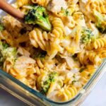 A comforting Chicken Noodle Casserole made with rotini pasta, broccoli, tender cooked chicken, and a creamy homemade cheese sauce, baked to bubbly perfection with melted cheddar cheese on top.
