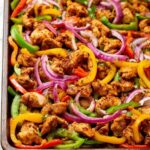 Sheet Pan Chicken Fajitas are an easy, flavorful, and mess-free weeknight dinner option featuring juicy chicken breast strips baked with colorful bell peppers and onions, seasoned with a vibrant blend of spices and finished with a squeeze of fresh lime juice. Serve with tortillas, salsa, shredded cheese, and fresh green onions or cilantro for a delicious Tex-Mex meal.