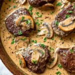 This Steak Diane recipe features tender filet mignon medallions pan-seared to a perfect medium-rare and smothered in a luscious, creamy mushroom sauce infused with shallots, garlic, tomato paste, Worcestershire sauce, Dijon mustard, and fresh herbs. Served over fluffy mashed potatoes and garnished with fresh parsley and optional chives, this elegant dish elevates a classic steakhouse favorite with rich flavors and expert techniques for perfectly caramelized mushrooms and an indulgent sauce.