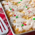 - Cool and Glaze: Allow the cake to cool completely in the pan on a wire rack. Once cooled, drizzle the eggnog glaze evenly over the top. Add sprinkles for garnish if desired.