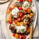 Enjoy a delightful Grilled Chicken Caprese with Burrata, combining juicy grilled chicken breasts, fresh cherry tomatoes, basil, creamy burrata cheese, and a sweet tangy balsamic glaze. This recipe offers a perfect balance of sweet, savory, and refreshing flavors, ideal for an easy weeknight dinner.