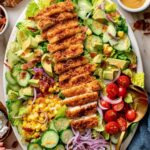 - Assemble the Salad: On a large platter, layer the chopped romaine lettuce, cucumber slices, cherry tomatoes, crumbled bacon, diced avocado, corn, and sliced red onion. Slice the cooked chicken into strips and arrange on top.