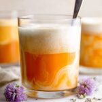 - Blend Carrot Mixture: In a blender, combine the rough chopped carrot, turmeric, and coconut water (or orange juice). Blend until completely smooth and no carrot chunks remain, adding water if needed to thin the mixture. Pour into a tall glass.