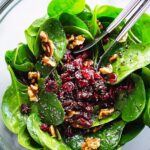 - Add the toppings: Sprinkle the roughly chopped pecans and dried sweetened cranberries evenly over the dressed spinach. Toss lightly one more time if desired to distribute toppings.