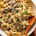 - Serve: Spoon the creamy beef stroganoff over the cooked egg noodles. Garnish with chopped fresh parsley and an extra twist of black pepper if desired. Serve warm.