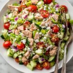This 30-minute Greek-inspired dinner features juicy grilled chicken marinated in a lemony, garlicky vinaigrette that doubles as a fresh salad dressing. Combined with crisp cucumbers, ripe tomatoes, crunchy bell peppers, tangy feta, and optional herbs, this salad is perfect for a light yet satisfying summer meal, served with grilled pita bread.