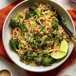 - Toss Noodles and Vegetables: Return the cooked noodles to the skillet along with the sautéed broccoli, optional edamame, and toasted sesame seeds. Use tongs to toss everything until the noodles are well coated in the sauce.
