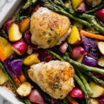A simple and wholesome sheet pan chicken and vegetables recipe featuring tender bone-in, skin-on chicken thighs roasted alongside colorful carrots, green beans, baby red potatoes, and red onion, flavored with fresh herbs and garlic for a healthy, one-pan dinner.