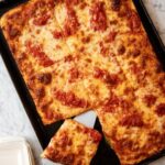 Grandma’s Sicilian-Style Sheet Pan Pizza is a delicious and flavorful pizza combining a thick, airy crust with zesty tomato sauce, fresh mozzarella, provolone, spicy pepperoni, and parmesan. This unique sheet pan pizza blends Sicilian and Detroit-style pizza techniques for a perfect, crowd-pleasing meal made easily without a rolling pin.