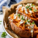 This Slow Cooker Buffalo Chicken recipe offers a hearty and healthy Whole30-friendly meal featuring tender shredded chicken cooked in a spicy buffalo sauce, served inside perfectly baked sweet potatoes and topped with ranch dressing for a flavorful finish.