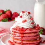 Delight in fluffy strawberry pancakes infused with freeze-dried strawberry powder, offering a flavorful twist to your classic breakfast. These pancakes are light, sweet, and perfectly golden, ideal for a cozy morning served with whipped cream, fresh strawberries, and syrup.