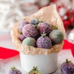 Deliciously soft and chewy Sugar Plum Cookies filled with a homemade spiced plum jam, dipped in vibrant colored syrup, and coated in sugar. Made with olive oil for a subtle earthy flavor, these festive cookies are perfect for the holidays and stay moist for days.