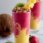 - Blend the Smoothie: In a high-powered blender, combine the frozen raspberries or strawberries, banana, coconut milk, frozen mango chunks, pineapple juice, vanilla bean seeds, and optional cubed pineapple and sliced kiwi. Blend until smooth and creamy.